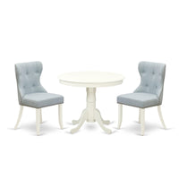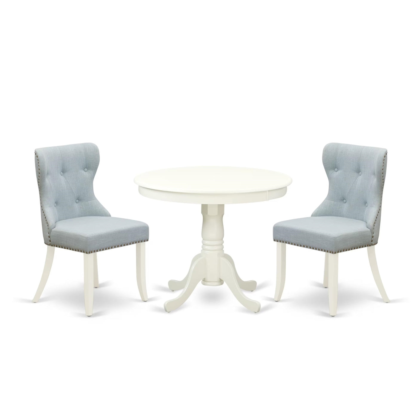 Ansi3-Lwh-15 East-West Furniture Ansi3-Lwh-15 - A Dining Set Of 2 Fantastic Indoor Dining Chairs With Linen Fabric Baby Blue Color And A Gorgeous 36-Inch Antique Modern Dining Table With Linen White Color, East West Furniture Ansi3-Lwh-15 Of 2-Piece Indoor Dining Chairs With Linen Fabric Baby Blue Color And A Delightful Modern Dining Table With Linen White Colorthis Superb 36-Inch Antique Wooden Dining Table Can Bring The Exceptional Impression Of The Dining Beauty To Both Typical And Stylish Decoration. This Modern Dining Table Set Will Deliver A Great Dose Of Charm To Your Dining Room. The Wonderful 3-Piece Traditional Dining Set Emphasizes Its Curves And Details, Giving An Otherwise Traditional Set A Little Modern Twist. The Body Of These Unique Parson Chairs And Dining Table Is Made From Superior Quality Asian Wood (Rubber Wood) Which Provides Wonderful Sturdiness And Stability To These Dining Chairs And Wooden Dining Table. Modern Sturdy Hardwood Structure, Comfortable Upholstered Seat, And Stylish Back, Reliable Wooden Dining Table Offer Leading Edge Eyes To Your Kitchen, Amazing Stability To This Excellent Pedestal Kitchen Table Set, And Cozy Support To Your Back. Because Of The Lightweight, This Dining Room Table Set Is Super Easy To Carry, Clean, Assemble And Alter Its Places, Classic Styles Of This Special 36-Inch Antique Wooden Table Meet Perfectly With Any Home Decor And A Smooth Oak Wooden Seat And Stylish Back Of These Dining Chairs Will Keep Users Comfortable.Chair Leg Wood Color: Linen Whitechair Fabric Material: Linen Chair Fabricfabric Color: Baby Bluedinner Table Color: Linen Whitekitchen Chairs Dimensions: Length 21.5 X Width 19.5 X Height 35.7Modern Dining Table Dimensions: Length 36 X Width 36 X Height 30Package Includes: 2 Kitchen Chairs And A 36-Inch Round Wooden Dining Table