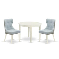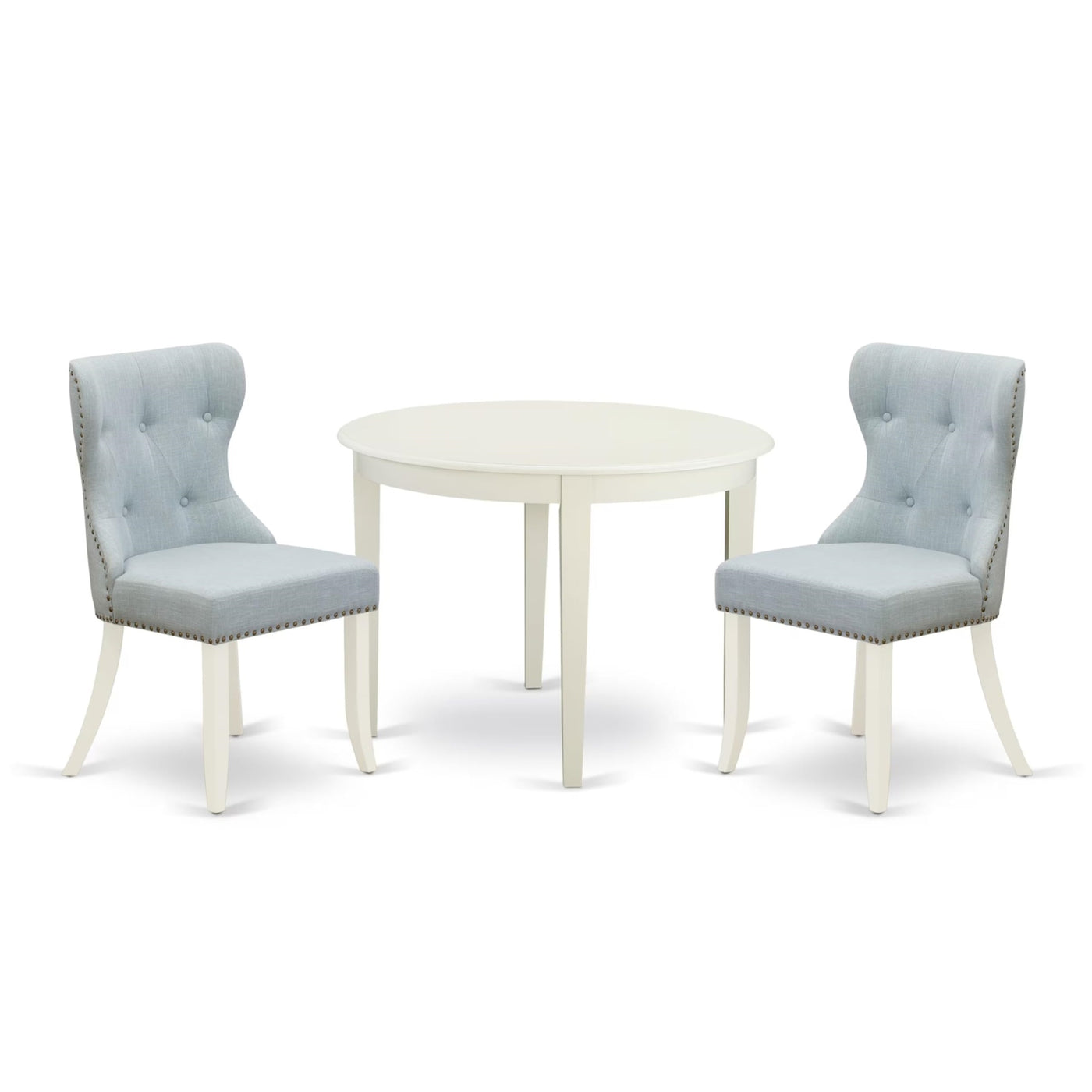 Casafoyer Bosi3-Whi-15 Boston 3 Piece Set For Small Spaces Contains A Round Kitchen Table And 2 Baby Blue Fabric Parson Dining Chairs, Linen White