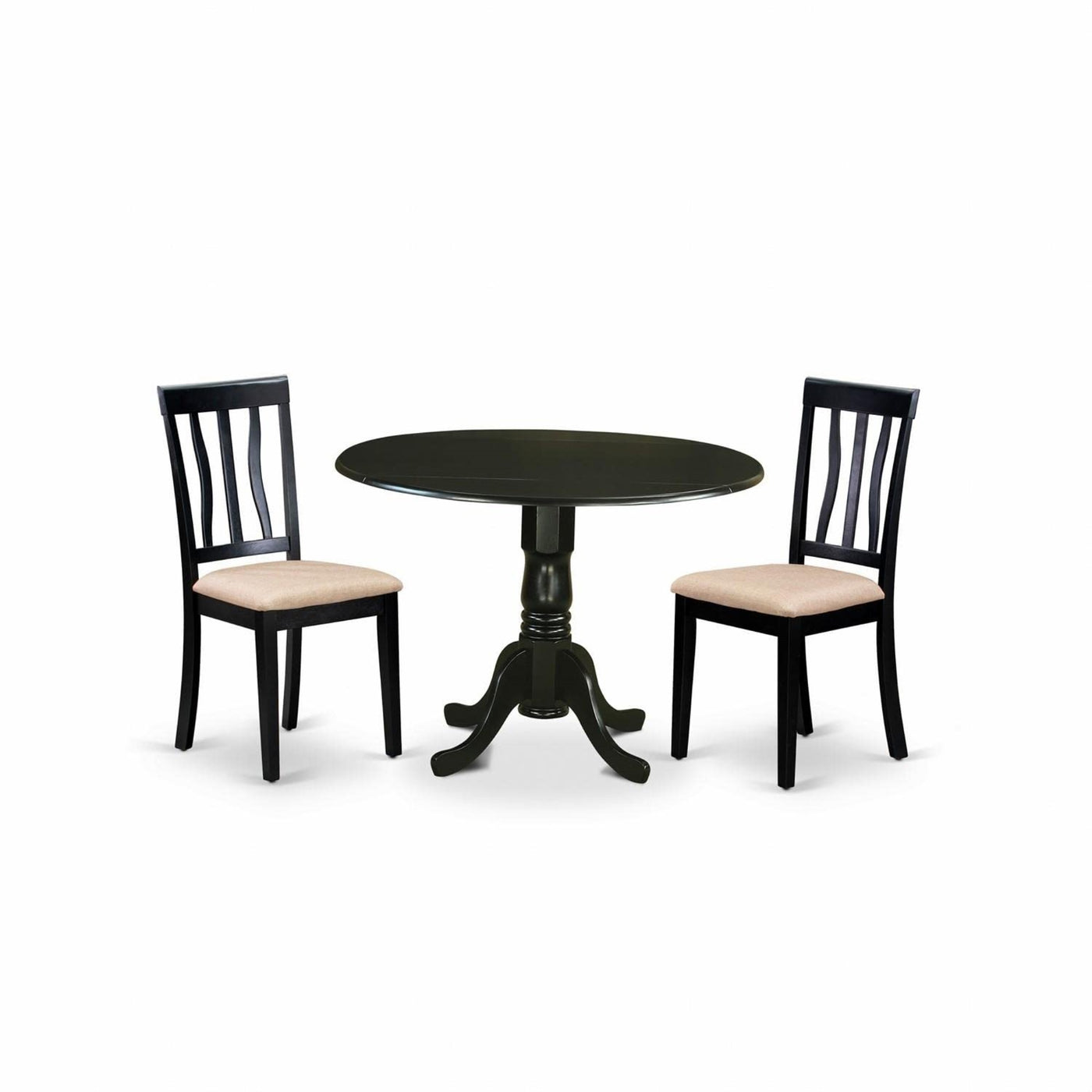 Casafoyer Dlan3-Blk-C 3 Piece Dining Table Set For Small Spaces Contains A Round Dining Room Table With Dropleaf And 2 Linen Fabric Upholstered Chairs, 42X42 Inch, Black