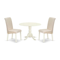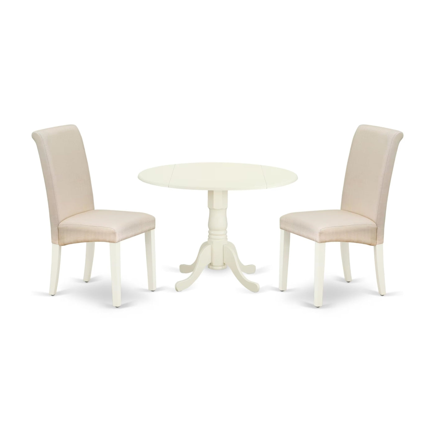Casafoyer Dlba3-Whi-01 3 Piece Modern Dining Table Set Contains A Round Wooden Table With Dropleaf And 2 Cream Linen Fabric Upholstered Parson Chairs, 42X42 Inch, Linen White