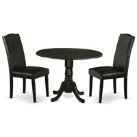 Dlen3-Blk-69 Dlen3-Blk-69 3Pc Round 42 Inch Dining Table With Two 9-Inch Drop Leaves And Two Parson Chair With Black Leg And Pu Leather Color Black, The Dlen3-Blk-69 Kitchen Dinette Set Brings The Elegance Of Asian Wood In The Dining Area. This Fantastic Round Dining Table Features Black Color That Complements A Number Of Different Attractive Themes. The Drop Down Leaf Can Be Easily Expanded The Kitchen Table Making More Personal Space For Certain Occasions Or Great Parties. A Single Bevel Edge And A Rounded Finish Provide This Dining Room Tables Fits Into A Small Kitchen Space, Great For Compact Apartments. The Dinette Table Is Created From Prime Quality Rubber Wood Known As Asian Hardwood. No Heat Treated Pressured Wood Like Mdf, Particle Board Or Veneer Top Fabricated. This Simple But Charming Parson Chair Will Add Ambiance And Style To Your Dining-Room. Give Your Home A Pop Of Chic Style With This Must-Have Parson Chair. A Contemporary Twist On A Classic Design, This Eye-Catching Design Will Liven Up Any Look. The Traditional Parson Gives This Chair A Touch Of Familiar Charm, While The Pu Leather-Black Color And Clean-Lined Design Elevate This Chair With Modern Flair. Just By Switching Out Your Old Dining Set With This One, You Can Effortlessly Refresh Your Space. This Budget Friendly, Durable And Comfortable Dining Set Can Be Good Choice If You Are Looking For A Great Dining Time Experience With Family And Friends.Table Specifications:Material: Asian Hardwoodcolor: Blackdimensions: Length 42; Width 42; Height 29.5Weight Capacity: 300 Lbschair Specifications:Material: Asian Hardwoodfabric: Pu Leathercushion Material: Foamfabric Color: Blackleg Color: Blackdimensions: Length 23; Width 18; Height 40Weight Capacity: 300 Lbsincludes:1 X Round Table2 X Parson Chairn.B.: Hardware Package And Instruction Manual Is Located In/Under The Seat.