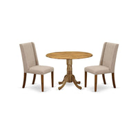 Casafoyer Dublin 3 Piece Set Contains A Round Dining Room Table With Dropleaf And 2 Light Tan Linen Fabric Upholstered Chairs, 42X42 Inch, Natural
