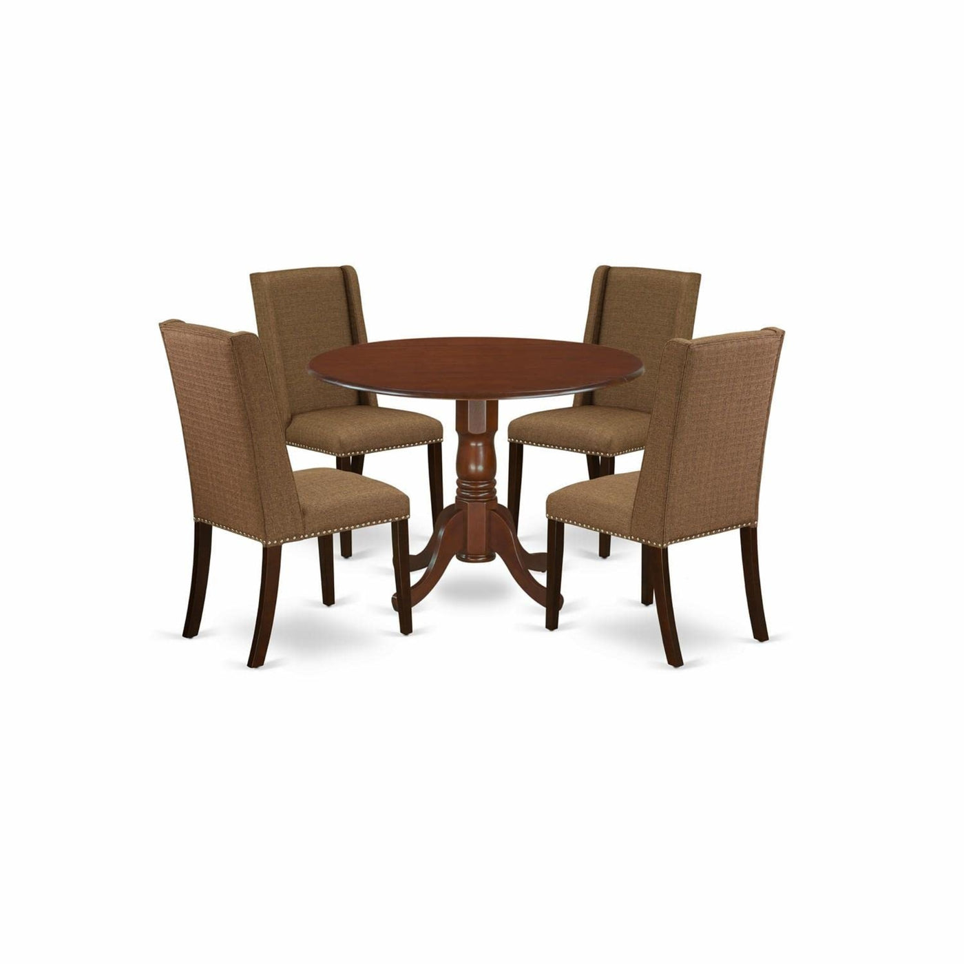 Casafoyer Dublin 5 Piece Kitchen Set For 4 Includes A Round Room Table With Dropleaf And 4 Brown Linen Fabric Parson Dining Chairs, 42X42 Inch, Mahogany
