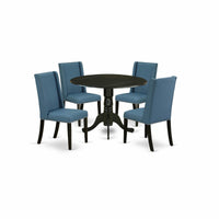Dlfl5-Blk-21 East West Furniture Dlfl5-Blk-21 5-Piece Dining Kitchen Table Set Included A Round Dining Room Table & 4 Parson Dining Chairs, Mineral Blue Linen Fabric Kitchen Chairs Seat With Rubber Wood Legs, Black Finish, East West Furniture 5-Pc Kitchen Dinette Set Including 4 Dining Chairs And A Round Luxurious Kitchen Table Will Boost The Luxury Of Your Dining Room Or Kitchen Areas. This Dining Set Is Made Of Durable Asian Wood, Known As Rubber Wood, Which Is Rugged Enough To Withstand Years Of Use. It Also Has An Ergonomic Design, Which Is Very Comfortable. Single Dinner Table With 4 Fabric Kitchen Chairs Is In Black Finish. This Modern Dining Table Set Would Add Charm And Attractiveness To Your Kitchen Or Dining Room. This Wood Dining Table Is Flexible And Cozy. This Dinner Table Features A Compact Design Ideal For Small Spaces. The Kitchen Parson Chair Seat Is Crafted From Soft Linen Fabric Cushion, With Solid Rubber Wood Legs And Stylish Soft Linen Fabric Backrest With Asian Wood Structure, Soft Cushion, And Stylish Backrest Design To Make You More Comfortable. Our Dinette Table Set Adds Some Modern Charm To Your Home. Parson Chairs And A Modern Dining Table Give Plenty Of Space For Your Family Or Friends. The Simplistic And Elegant Design, Accentuated By A Glossy Black Finish. You Will Certainly Enjoy This Wonderful Dinette Table Set. It'S Quick To Assemble The Fabric Kitchen Chairs And Breakfast Table With A Simple Tool. No Additional Tools Are Required. Easy-To-Follow Instructions, Tools, And Hardware Are Included. With The Help Of A Damp Cloth, You Will Clean Up Your Dusty Easily. Buy Our Products In Full Confidence, Because Your Satisfaction Is Our #1 Priority. Feel Free To Contact Us, We Are Always Here For You.Features:Linen Fabric Parson Chairs Seat Color: Mineral Blueparson Dining Chairs Legs Color: Blackupholstered Dining Chairs Sizes: Length 19.25; Width 25; Height 40.5Modern Dining Table Color: Blackliving Room Table Sizes: Length 42; Width 42; Height 29.5Included: A Beautiful Dinette Table And 4 Brilliant Parsons Chairs.