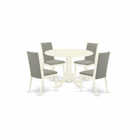 Dlla5-Whi-06 East West Furniture Dlla5-Whi-06 5-Piece Kitchen Table Set Included A Round Dining Room Table & 4 Upholstered Dining Chairs, Shitake Linen Fabric Parsons Chairs Seat With Rubber Wood Legs, Linen White Finish, East West Furniture 5-Pc Modern Dining Table Set Including 4 Dining Chairs And A Round Luxurious Breakfast Table Will Boost The Luxury Of Your Dining Room Or Kitchen Areas. Our Mid Century Dining Table Set Is Manufactured From Strong Asian Wood, Known As Rubber Wood, Which Is Rugged Enough To Withstand Years Of Use. It Also Has An Ergonomic Design, Which Is Very Comfortable. Single Dining Table With 4 Parson Dining Chairs Is In Linen White Finish. This Dining Room Table Set Would Add Charm And Attractiveness To Your Kitchen Or Dining Room. This Wood Dining Table Is Adaptable And Comfortable. This Pedestal Dining Table Features A Compact Design Perfect For Small Spaces. The Parson Chair Seat Is Made Of Soft Linen Fabric Cushion, With Solid Rubber Wood Legs And Stylish Soft Linen Fabric Backrest With Asian Wood Frame, Soft Cushion And Stylish Backrest Design To Make You More Comfortable. Our Kitchen Table Set Adds Some Modern Beauty To Your Home. Kitchen Chairs And A Dining Table Provide Plenty Of Space For Your Family Or Friends. The Simplistic And Classy Design Is Accentuated By A Glossy Linen White Finish. You Will Definitely Enjoy This Gorgeous Round Dinette Set. It'S Quick To Assemble The Kitchen Chairs And Round Dining Table With A Simple Tool. No Additional Tools Are Required. Easy-To-Follow Instructions, Tools, And Hardware Are Included. With The Help Of A Damp Cloth, You Will Clean Your Dusty Quickly. Buy Our Products In Full Confidence, Because Your Satisfaction Is Our #1 Priority. Feel Free To Contact Us; We Are Always Here For You.Features:Linen Fabric Parsons Chairs Seat Color: Shitakeparson Chair Legs Color: Linen Whitekitchen Chairs Sizes: Length 24; Width 20; Height 39Breakfast Table Color: Linen Whiteliving Room Table Sizes: Length 42; Width 42; Height 30Included: A Stunning Round Dining Table And 4 Excellent Kitchen Chairs.
