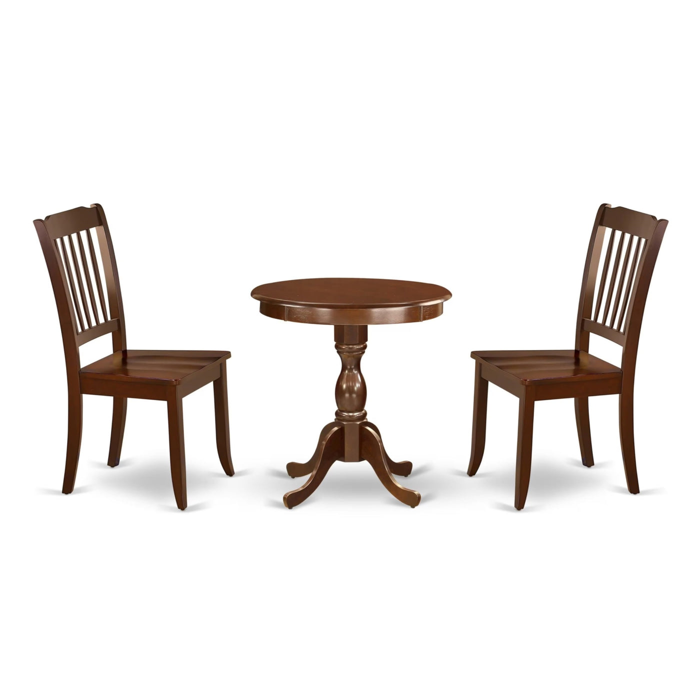 Esda3-Mah-W East West Furniture - Esda3-Mah-W - 3-Pc Modern Dining Table Set - 2 Kitchen Chairs And 1 Dining Room Table (Mahogany Finish), East West Furniture - Esda3-Mah-W - 3-Pc Dining Table Setthis Kitchen Table Set Includes 2 Mid Century Dining Chairs And 1 Modern Dining Room Table. This Dining Table Has A Round Table Top And Beautiful Legs. The Solid Wood Frame And Back Ensure That These Wooden Chairs Sturdiness And Offers Decent Support To Your Back, In Addition To Their Ideal Size These Urban Style Chairs Are Trouble Free To Assemble And Easy To Rearrange. These Simple But Charming Kitchen Chairs Will Add Ambiance And Style To Your Dining Room. Give Your Home A Pop Of Chic Style With This Must Have Modern Dining Table Set. A Contemporary Twist On A Classic Design, This Eye-Catching Modern Dining Table Set Design Will Liven Up Any Timeless Appeal. Just By Switching Out Your Dining Chairs And Round Table, You Can Effortlessly Refresh Your Dining Space. This Modern Dining Set Is Very Easy To Assemble. You Only Need Around 30 Minutes To Build This Dinette Room Set. This Dining Room Table Set Comes With All The Necessary Hardware To Assemble This Dining Table Set. These Wooden Dining Room Chairs Are Easy To Carry Or Move Around. Enjoy With East West Furniture!Features:Material: Woodseat Material: Woodwood Chairs Color: Mahoganykitchen Table Color: Mahoganyround Table Dimensions Are: Length 30; Width 30; Height 36.Mid Century Wooden Chairs Dimensions Are: Length 21; Width 18; Height 39.Included In The Package: 1 Beautiful Wooden Dining Table And 2 Marvelous Modern Wooden Dining Chairs.
