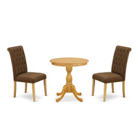 Esbr3-Oak-18 East West Furniture - Esbr3-Oak-18 - 3-Pc Dining Room Table Set - 2 Mid Century Dining Chairs And 1 Dining Table (Oak Finish), East West Furniture - Esbr3-Oak-18 - 3-Pc Modern Dining Table Setour Kitchen Table Set Includes 2 Mid Century Upholstered Dining Chairs And 1 Round Dining Table. This Wood Dining Table Has A Round Table Top And Beautiful Legs. The Hardwood Frame And Soft Padded Back Ensure That These Dining Chairs Sturdiness And Offers Decent Support To Your Back, In Addition To Their Ideal Size These Urban Style Chairs Are Trouble Free To Assemble And Easy To Rearrange. These Simple But Charming Parson Chairs Will Add Ambiance And Style To Your Dining Room. Give Your Home A Pop Of Chic Style With This Must Have Kitchen Table Set. A Contemporary Twist On A Classic Design, This Eye-Catching Kitchen Dining Room Set Design Will Liven Up Any Timeless Appeal. Just By Switching Out Your Chairs And Dining Table, You Can Effortlessly Refresh Your Dining Space. This Kitchen Dining Room Set Is Very Easy To Construct. You Only Need Around 30 Minutes To Build This Modern Dining Set. This Modern Dining Set Comes With All The Necessary Hardware To Put Together This Kitchen Table Set. These Mid Century Dining Chairs Are Easy To Carry Or Move Around. Enjoy With East West Furniture!Features:Fabric: Linen Fabriccushion Material: Foamfabric Color: Brownwooden Dining Table Top Color: Oakparson Chairs Dimensions Are: Length 26; Width 19; Height 42.Dining Room Table Dimensions Are: Length 30; Width 30; Height 36.Included In The Package: 1 Fabulous Dining Table And 2 Stunning Kitchen Parson Chairs.