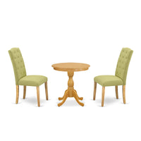 Esce3-Oak-07 East West Furniture - Esce3-Oak-07 - 3-Pc Modern Dining Set - 2 Parson Dining Room Chairs And 1 Dining Room Table (Oak Finish), East West Furniture - Esce3-Oak-07 - 3-Pc Dining Room Table Setits Kitchen Table Set Includes 2 Mid Century Kitchen Parson Chairs And 1 Modern Round Dining Table. This Dining Table Has A Round Table Top And Stunning Legs. The Hardwood Frame And Soft Padded Back Ensure That These Mid Century Dining Chairs Sturdiness And Offers Decent Support To Your Back, In Addition To Their Ideal Size These Urban Style Chairs Are Trouble Free To Construct And Easy To Rearrange. These Simple But Charming Dining Room Chairs Will Add Ambiance And Style To Your Dining Room. Provide Your Home A Pop Of Chic Style With This Must Have Kitchen Dining Set. A Contemporary Twist On A Classic Design, This Eye-Catching Dinette Set Design Will Liven Up Any Timeless Appeal. Just By Switching Out Your Chairs And Round Dining Table, You Can Effortlessly Refresh Your Dining Space. This Modern Dining Set Is Very Easy To Put Together. You Only Need Around 30 Minutes To Build This Dining Room Set. This Dining Table Set Comes With All The Necessary Hardware To Put Together This Dining Table Set. These Padded Parson Chairs Are Easy To Carry Or Move Around. Enjoy With East West Furniture!Features:Fabric: Linen Fabriccushion Material: Foamfabric Color: Limelightdining Table Top Color: Oakpadded Parson Chairs Dimensions Are: Length 23; Width 18; Height 40.Modern Kitchen Table Dimensions Are: Length 30; Width 30; Height 36.Included In The Package: 1 Stunning Wood Dining Table And 2 Stunning Padded Parson Chairs.
