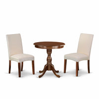 Esdr3-Mah-01 East West Furniture - Esdr3-Mah-01 - 3-Pc Dining Room Set - 2 Dining Room Chairs And 1 Kitchen Dining Table (Mahogany Finish), East West Furniture - Esdr3-Mah-01 - 3-Pc Kitchen Dining Room Setits Modern Dining Set Includes 2 Mid Century Kitchen Parson Chairs And 1 Wooden Dining Table. This Wooden Dining Table Has A Round Table Top And Stunning Legs. The Hardwood Frame And Soft Padded Back Ensure That These Kitchen Chairs Sturdiness And Offers Decent Support To Your Back, In Addition To Their Ideal Size These Urban Style Chairs Are Trouble Free To Put Together And Easy To Rearrange. These Simple But Charming Kitchen Chairs Will Add Ambiance And Style To Your Dining Room. Offer Your Home A Pop Of Chic Style With This Must Have Kitchen Dining Room Set. A Contemporary Twist On A Classic Design, This Eye-Catching Dinette Set Design Will Liven Up Any Timeless Appeal. Just By Switching Out Your Chairs And Kitchen Dining Table, You Can Effortlessly Refresh Your Dining Space. This Dining Room Table Set Is Very Easy To Assemble. You Only Need Around 30 Minutes To Build This Dining Room Table Set. This Dining Room Table Set Comes With All The Necessary Hardware To Construct This Dinette Room Set. These Mid Century Dining Chairs Are Easy To Carry Or Move Around. Enjoy With East West Furniture!Features:Fabric: Linen Fabriccushion Material: Foamfabric Color: Creamwooden Dining Table Top Color: Mahoganypadded Parson Chairs Dimensions Are: Length 24; Width 19; Height 39.Modern Kitchen Table Dimensions Are: Length 30; Width 30; Height 36.Included In The Package: 1 Beautiful Dining Table And 2 Fabulous Parson Chairs.