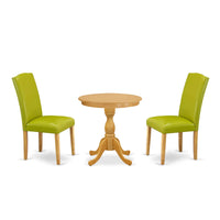 Casafoyer Esen3-Oak-51 3 Piece Modern Dining Table Set Contains A Round Wooden Table With Pedestal And 2 Autumn Green Faux Leather Upholstered Chairs, 30X30 Inch, Oak