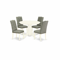 Shel5-Whi-07 East West Furniture Shel5-Whi-07 5-Piece Dining Table Set- 4 Parson Chairs And Dining Room Table Solid Wood Frame - High Back Button Tufted & Linen White Finish, East West Furniture 5-Piece Kitchen Table Sets 4 Amazing Parsons Dining Room Chairs And Rectangular Modern Dining Table This Modern Dining Table Set Includes 4 Remarkable Parson Chairs And An Awesome 4 Legs Dining Table. The Modern Dining Set Delivers A Linen White Hardwood Dining Room Table And Frame And A Fantastic Smoke Parson Chairs Seat And Button Tufted That Bring Magnificence To Your Dining-Room And Improve The Charm Of Your Great Dining Area. The High Quality Of Our Beautiful Chairs Helps Our Beautiful Customers To Get Relaxation And Feel Free When Getting Their Meal. This Kitchen Table Built From Premium Quality Rubber Wood Which Can Bear The Weight Of 300 Lbs. Our Parson Chairs Have A Wooden Frame With A Luxury Seat Of Superior Quality Foam Which Is Covered With Linen Fabric That Gives You Relaxation With Family Or Friends. This Listing Has A Premium Color Of Linen White Finish For Pedestal Table And Smoke Parson Dining Chairs. Our Wonderful Premium Colors Improve The Beauty Of Your Living Area And Give A Luxurious Appearance To Your Living Area Or Dining Area. East West Furniture Always Built From Modern Furniture Along With Easy Assembling Parts. We Try To Keep Our Furniture Parts Modern As Well As Simple. Our High-Class Pedestal Dining Table Set Is Best For Your Wonderful Dining Room As Well As The Kitchen. You Can Use It For Casual Home Parties. Keep Enjoying East West Modern Furniture! Features: Kitchen Dining Table Dimension: Length 42; Width 42; Height 30. Wood Color: Linen White Fabric: Linen Fabric Parson Chairs Dimension: Length 24.5; Width 19; Height 40.5. Fabric Color: Smoke Package Include: 4 Lovely Parson Chairs And A Gorgeous Pedestal Dining Table.