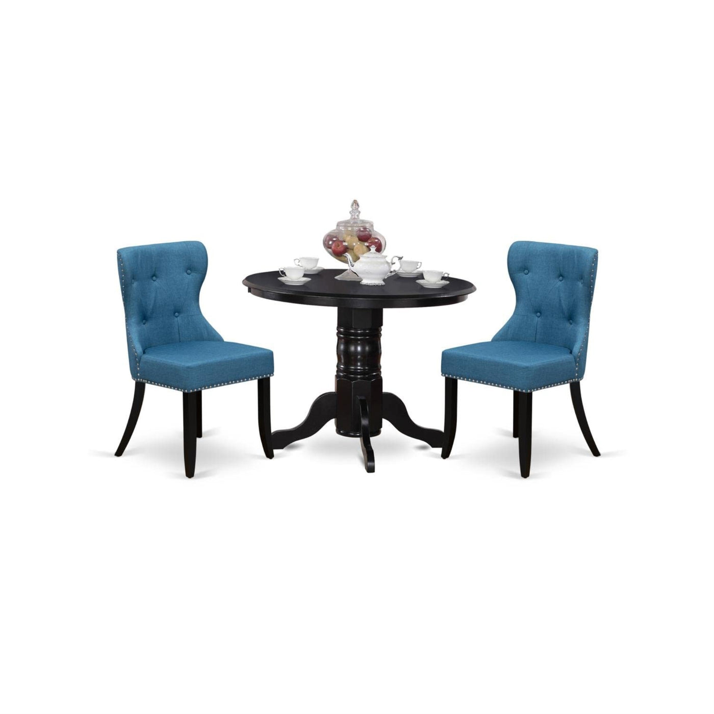 Casafoyer Shsi3-Blk-21 3 Piece Kitchen Table Set For Small Spaces Contains A Round Dining Table With Pedestal And 2 Blue Linen Fabric Parson Chairs, 42X42 Inch, Black