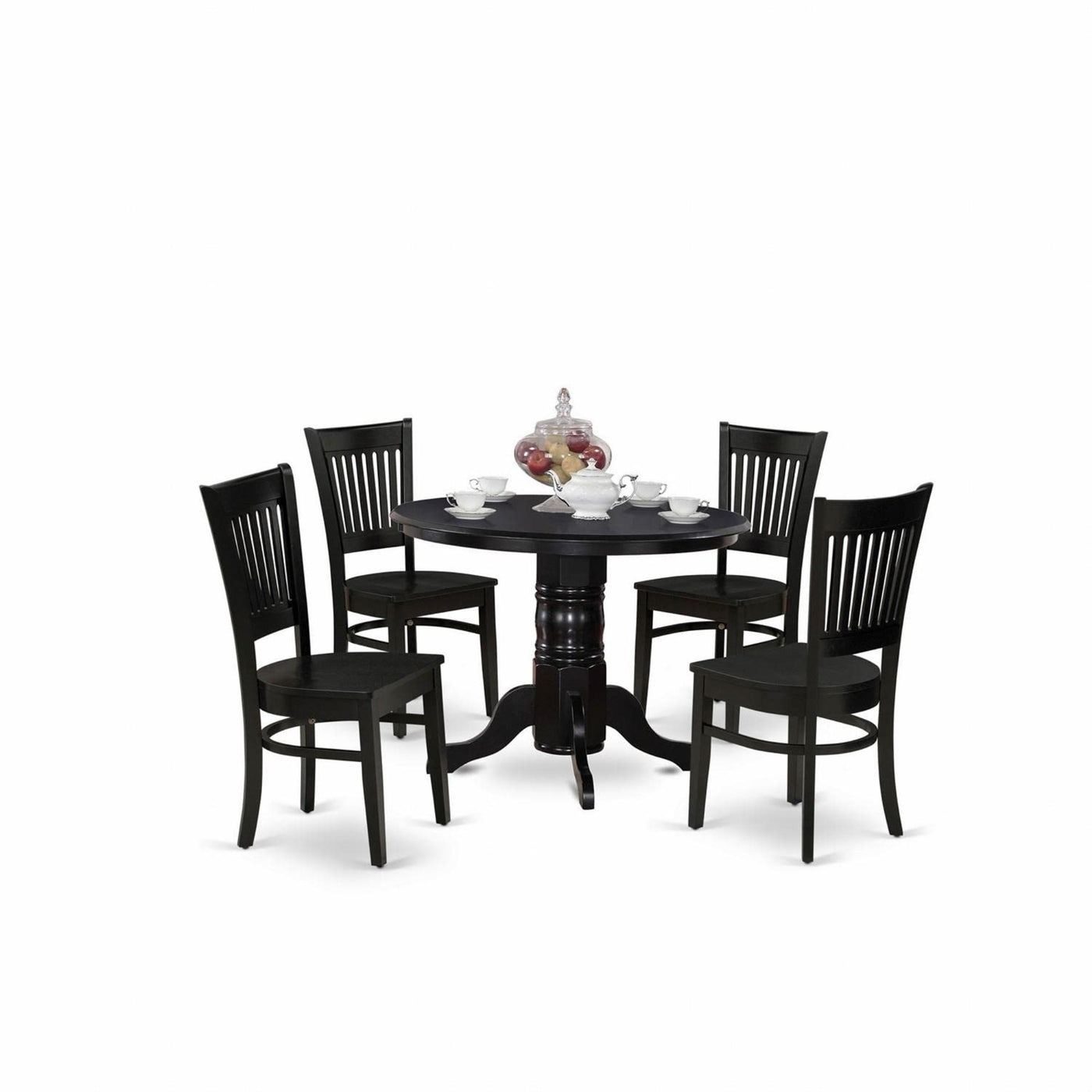 Shva5-Blk-W East West Furniture - Shva5-Blk-W - 5-Pc Dining Room Set- 4 Dining Room Chair And Dinner Table - Linen Fabric Seat And Slatted Chair Back - Black Finish, East West Furniture - Shva5-Blk-W - 5-Piece Dining Room Setthis 5-Piece Dining Room Set Includes 4 Wooden Chairs And 1 Kitchen Dining Table. These Dining Chairs Have A Linen Fabric Seat, Slatted Chair Back, And A Round Dining Table That Includes A Round Tabletop And Pedestal Legs. We Have Created These Dining Room Chairs And Dining Table With The Help Of Highly Experienced Carpenters, Who Generate A Smooth And High-End Finish To This Dinette Room Set. We Try To Offer Innovation As Well As Ease To Build. Our Top Quality Kitchen Dining Set Is Ideal For You And Any Dining Area. This Modern Dining Set Can Be Used For Casual Home Parties Or Intimate Gatherings.Features:Frame Material: Asian Solid Wooddining Room Chairs Seating Material: Linen Fabricdining Room Chairs Legs Color: Blackkitchen Dining Table Base Color: Blackround Table Top Color: Blackwood Chair Dimensions: Length 17; Width 20; Height 37.Dining Table Dimensions: Length 42; Width 42; Height 30.Include In Package 5-Pc Kitchen Dining Room Set 4 Kitchen Chair And 1 Dinner Table.