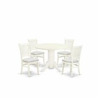 Shva5-Lwh-C East West Furniture - Shva5-Lwh-C - 5-Piece Dining Room Table Set- 4 Dining Room Chairs And Modern Dining Room Table - Linen Fabric Seat And Slatted Chair Back - Linen White Finish, East West Furniture - Shva5-Lwh-C - 5-Pc Dinette Setthese 5-Piece Dining Room Table Set Includes 4 Dining Room Chair And 1 Wooden Dining Table. These Dining Chairs Have A Linen Fabric Seat, Slatted Chair Back, And The Wood Dining Table Consists Of A Round Tabletop And Pedestal Legs. We Have Created These Dining Room Chairs And Breakfast Table With The Help Of Highly Experienced Carpenters, Who Generate A Smooth And High-End Finish To This Dining Table Set. We Try To Offer Innovation As Well As Ease To Put Together. Our Superior Quality Kitchen Dining Room Set Is Great For You And Any Dining Room. This Dining Room Table Set Can Be Used For Casual Home Parties Or Intimate Gatherings.Features:Frame Material: Asian Solid Wooddining Chair Seating Material: Linen Fabricmid Century Dining Chairs Legs Color: Linen Whitemodern Round Dining Table Base Color: Linen Whitewooden Dining Table Top Color: Linen Whitewooden Chairs Dimensions: Length 17; Width 20; Height 37.Round Table Dimensions: Length 42; Width 42; Height 30.Include In Package 5-Pc Modern Dining Set 4 Kitchen Chair And 1 Dining Table.