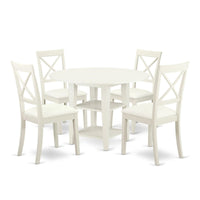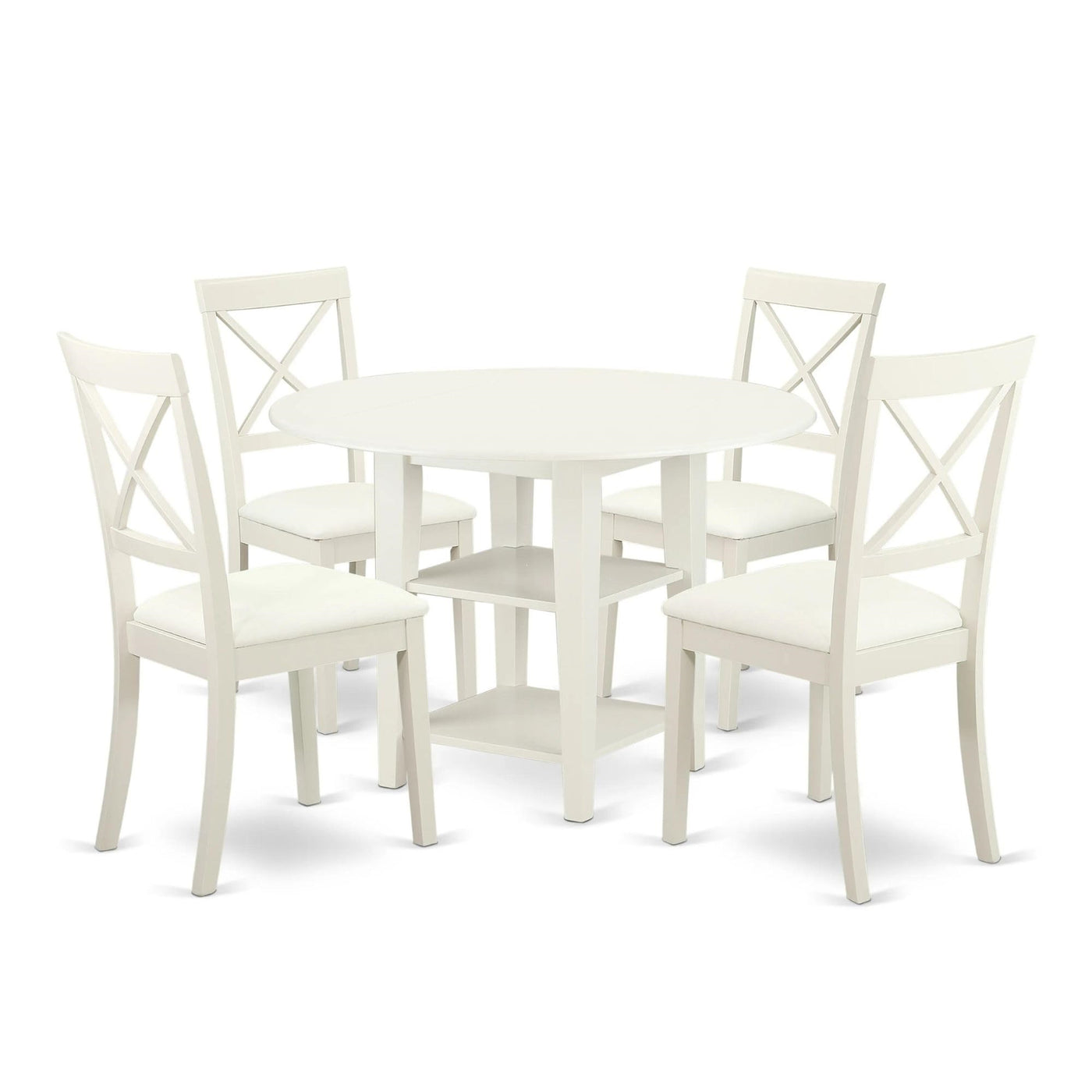 Casafoyer Subo5-Lwh-Lc 5 Piece Dining Set Includes A Round Dining Table With Dropleaf & Shelves And 4 Faux Leather Kitchen Room Chairs, 42X42 Inch, Linen White
