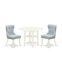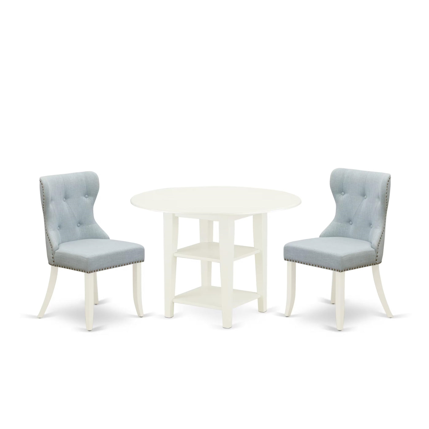 Susi3-Lwh-15 East-West Furniture Susi3-Lwh-15 - A Dining Room Table Set Of 2 Excellent Dining Chairs With Linen Fabric Baby Blue Color And A Lovely Dining Table With Linen White Color, East West Furniture Susi3-Lwh-15 Of Two Pieces Of Dining Room Chairs With Linen Fabric Baby Blue Color And A Gorgeous Modern Dining Table With Linen White Colorthis Superb Two-Side Drop Leaf And Two Shelves Round Wooden Table Can Deliver The Outstanding Impression Of The Dining Style To Both Typical And Stylish Decoration. This Wooden Dining Table Set Will Deliver A Wonderful Dose Of Beauty To Your Dining Area. The Stunning Three Pieces Of Old Fashioned Dining Table Set Emphasizes Its Curves And Details, Giving An Otherwise Traditional Set A Little Modern Twist. The Body Of These Unique Dining Room Chairs And Kitchen Table Is Created From Superior Quality Asian Wood (Rubber Wood) Which Provides Great Sturdiness And Stability To These Dining Room Chairs And Mid Century Dining Table. Modern Sturdy Hardwood Structure, Comfortable Upholstered Seat, And Stylish Back, Reliable Dinner Table Offer Leading Edge Look To Your Kitchen, Fantastic Stability To This Excellent Dinette Set, And Comfortable Support To Your Back. Because Of The Lightweight, This Dining Set Is A Breeze To Carry, Clean, Assemble And Alter Its Places, Classic Styles Of This Special Two-Side Drop Leaf And Two Shelves Round Dining Table Meet Perfectly With Any Home Decor And A Smooth Oak Wooden Seat And Stylish Back Of These Kitchen Chairs Will Keep Users Comfortable.Chair Leg Wood Color: Linen Whitechair Fabric Material: Linen Chair Fabricfabric Color: Baby Bluetwo-Side Drop Leaf And Two Shelves Round Dining Room Table Color: Linen Whiteparson Dining Chairs Dimensions: Length 21.5 X Width 19.5 X Height 35.33Wooden Dining Table Dimensions: Length 20/42 X Width 42 X Height 30Package Includes: 2 Kitchen Chairs And 1 Two-Side Drop Leaf And Two Shelves Round Dining Table
