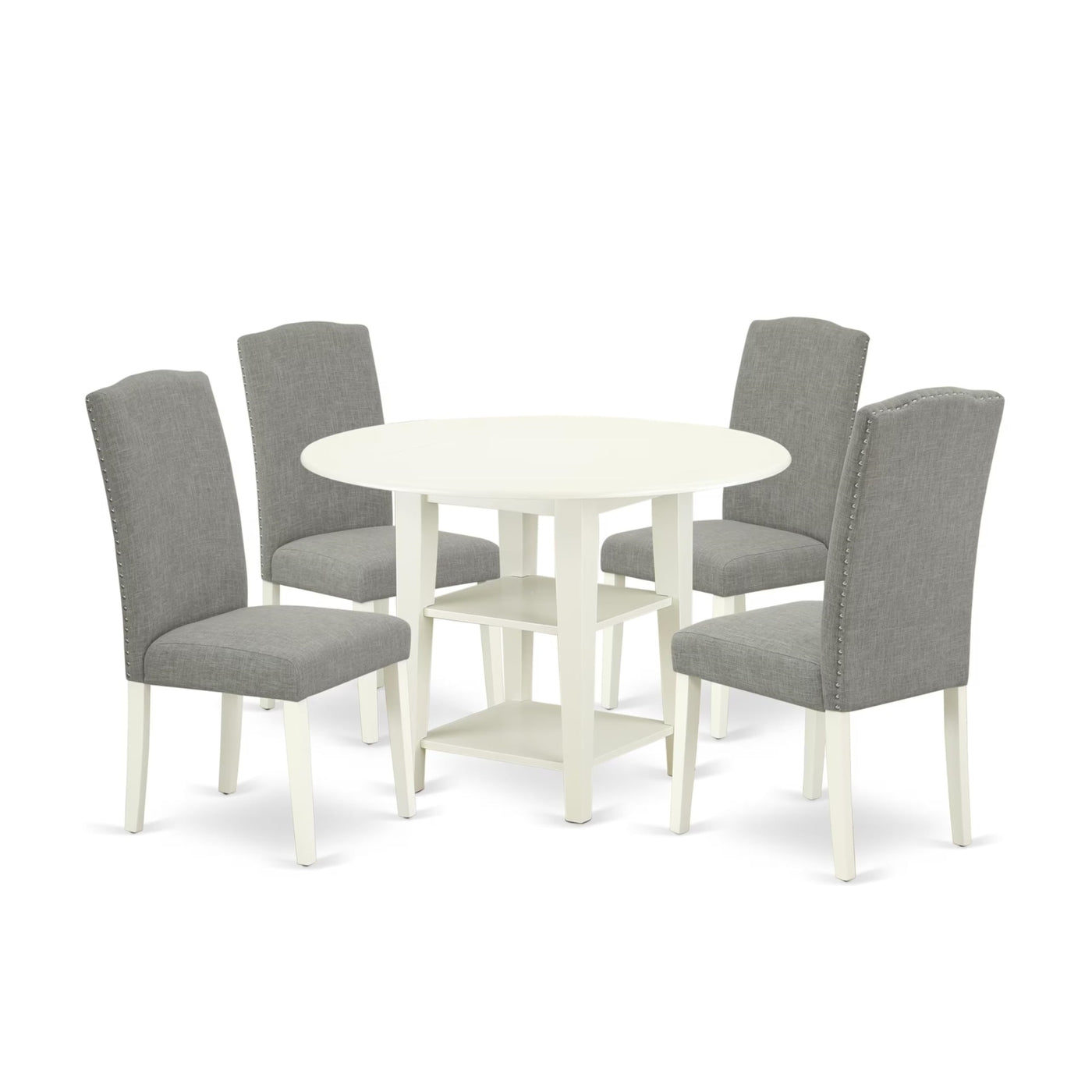 Casafoyer Suen5-Lwh-06 5 Piece Kitchen Table Set For 4 Includes A Round Dining Table With Dropleaf & Shelves And 4 Dark Shitake Linen Fabric Parsons Chairs, 42X42 Inch, Linen White