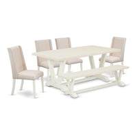 Casafoyer V-Style 6 Piece Room Set Contains A Rectangle Dining Table With V-Legs And 4 Cream Linen Fabric Parson Chairs With A Bench, 40X72 Inch, V027Fl201-6