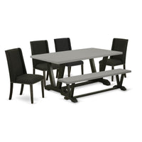 Casafoyer V-Style 6 Piece Set Contains A Rectangle Dining Room Table With V-Legs And 4 Black Linen Fabric Parson Chairs With A Bench, 40X72 Inch, V697Fl624-6