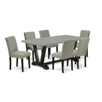 V697Ab106-7 East West Furniture V697Ab106-7 7-Pc Dining Room Table Set - 6 Padded Parson Chairs And 1 Modern Rectangular Cement Kitchen Dining Table Top With High Chair Back - Wire Brushed Black Finish, East West Furniture - V697Ab106-7 - 7-Pc Kitchen Dining Room Setits Dining Room Table Set Includes 6 Mid Century Upholstered Dining Chairs And 1 Rectangular Dining Table. This Kitchen Dining Table Has A Rectangular Table Top And Beautiful Legs. The Solid Wood Frame And Soft Padded Back Ensure That These Kitchen Parson Chairs Sturdiness And Offers Decent Support To Your Back, In Addition To Their Ideal Size These Urban Style Chairs Are Trouble-Free To Build And Easy To Rearrange. These Simple But Charming Dining Padded Chairs Will Add Ambiance And Style To Your Dining Room. Give Your Home A Pop Of Chic Style With This Must-Have Dining Room Table Set. A Contemporary Twist On A Classic Design, This Eye-Catching Dining Room Set Design Will Liven Up Any Timeless Appeal. Just By Switching Out Your Chairs And Rectangular Dining Table, You Can Effortlessly Refresh Your Dining Space. This Dinette Room Set Is Very Easy To Assemble. You Only Need Around 1 Hour To Build This Modern Dining Table Set. This Dining Room Table Set Comes With All The Necessary Hardware To Put Together This Dining Room Set. These Kitchen Chairs Are Easy To Carry Or Move Around. Enjoy With East West Furniture!Features:Fabric: Linen Fabriccushion Material: Foamfabric Color: Shitakewooden Dining Table Top Color: Cementdining Room Chairs Dimensions Are: Length 21; Width 17; Height 35.Wood Dining Table Dimensions Are: Length 72; Width 40; Height 30.Included In The Package: 1 Stunning Modern Dining Room Table And 6 Beautiful Dining Chairs.