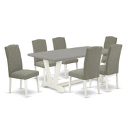 V097En206-7 East West Furniture 7-Piece Fashionable Modern Dining Table Set A Great Cement Color Wood Dining Table Top And 6 Stunning Linen Fabric Dining Chairs With Nail Heads And Stylish Chair Back, Linen White Finish, East West Furniture 7-Piece Kitchen Set With 6 Kitchen Parson Chairs And Rectangular Kitchen Tablethis Dining Table Set Includes 6 Wonderful Dining Chairs And An Amazing Dining Table. This Rectangular Dining Table Is Offered In An Elegant Linen White Finish. In Addition, The Parson Dining Chairs In A Dark Shitake Linen Fabric To Enhance The Elegance Of Any Kitchen Or Dining Room. Our Dining Set Delivers Great Durability Because This Rectangular Table Is Built From High Quality Asian Wood Which Can Bear The Weight Of 300 Lbs. We Have Created These Kitchen Chairs And Dining Table With The Help Of Highly Experienced Carpenters, Who Generate A Smooth And High-End Finish To This Dining Table Set. We Try To Offer Innovative As Well As Easy To Assemble Products. Our High-Quality Modern Dining Table Set Is Perfect For You And Your Beautiful Dining Area As Well As The Kitchen Area. You Can Use It For Casual Home Parties Or Intimate Gatherings. Keep Enjoying East West Modern Furniture!Features:Color Of Modern Dining Chairs: Dark Shitakecolor Of Kitchen Rectangular Table Top: Cementcolor Of Modern Dining Table Base: Linen Whitewood Table Dimensions: Length 72; Width 40; Height 30Dining Chairs Dimensions: Length 23; Width 18; Height 40Package Include: 6 Parson Dining Room Chairs And A Rectangular Wood Dining Table