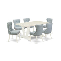 Casafoyer V-Style 7 Piece Set Consist Of A Rectangle Dining Room Table With V-Legs And 6 Baby Blue Linen Fabric Parsons Chairs, 36X60 Inch, Multi-Color