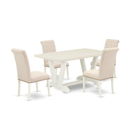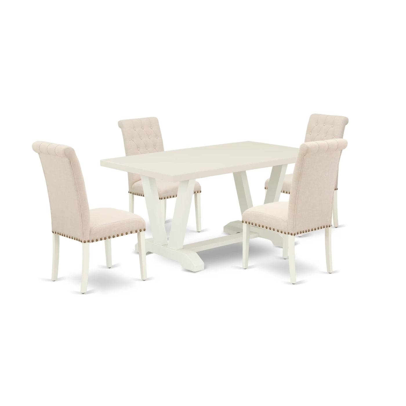 Casafoyer V026Br202-5 5 Piece Modern Dining Table Set Includes A Rectangle Wooden Table With V-Legs And 4 Light Beige Linen Fabric Upholstered Chairs, 36X60 Inch, Multi-Color
