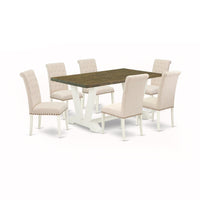 V076Br202-7 East West Furniture V076Br202-7 7-Piece Fashionable Rectangular Table Set A Great Distressed Jacobean Dining Table Top And 6 Stunning Linen Fabric Kitchen Chairs With Nail Heads And Button Tufted Chair Back, Linen White Finish, East West Furniture 7-Piece Rectangular Table Set With 6 Parson Dining Room Chairs And Rectangular Dining Room Tablethis Modern Dining Table Set Includes 6 Awesome Dining Chairs And A Beautiful Dining Table. This Modern Dining Table Is Offered In An Elegant Linen White Finish. In Addition, The Kitchen Chairs In A Light Beige Linen Fabric To Enhance The Elegance Of Any Kitchen Or Dining Area. Our Dinette Set Delivers Great Durability Because This Dining Table Is Built From High Quality Asian Wood Which Can Bear The Weight Of 300 Lbs. We Have Created These Modern Dining Chairs And A Rectangular Dining Table With The Help Of Highly Experienced Carpenters, Who Generate A Smooth And High-End Finish To This Kitchen Set. We Try To Offer Innovative As Well As Easy To Assemble Products. Our High-Quality Dining Table Set Is Perfect For You And Your Beautiful Dining Area As Well As The Kitchen Area. You Can Use It For Casual Home Parties Or Intimate Gatherings. Keep Enjoying East West Modern Furniture!Features:Color Of Dining Chairs: Light Beigecolor Of Dining Table Top: Distressed Jacobeancolor Of Modern Dining Table Base: Linen Whitedining Room Table Dimensions: Length 60; Width 36; Height 30Dining Chairs Dimensions: Length 26; Width 19; Height 42Package Include: 6 Padded Parson Chairs And A Rectangular Modern Dining Table