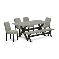 X697Ab106-6 East West Furniture X697Ab106-6 6-Pc Dining Set - 4 Dining Chairs, A Wood Bench Cement Top And 1 Modern Cement Kitchen Dining Table Top With High Chair Back - Wire Brushed Black Finish, East West Furniture - X697Ab106-6 - 6-Piece Modern Dining Setour Dining Room Set Includes 4 Parson Dining Room Chairs, A Mid-Century Modern Bench, And 1 Dining Room Table. This Breakfast Table And Wooden Bench Have A Rectangular Table Top And Lovely Legs. The Hardwood Frame And Soft Padded Back Ensure That These Kitchen Parson Chairs Sturdiness And Offers Decent Support To Your Back, In Addition To Their Ideal Size These Urban Style Chairs Are Trouble-Free To Build And Easy To Rearrange. These Simple But Charming Upholstered Dining Chairs Will Add Ambiance And Style To Your Dining Room. Offer Your Home A Pop Of Chic Style With This Must-Have Dining Table Set. A Contemporary Twist On A Classic Design, This Eye-Catching Dinette Room Set Design Will Liven Up Any Timeless Appeal. Just By Switching Out Your Chairs And Rectangular Table, You Can Effortlessly Refresh Your Dining Space. This Kitchen Table Set Is Very Easy To Assemble. You Only Need Around 1 Hour To Build This Dining Room Table Set. This Kitchen Dining Set Comes With All The Necessary Hardware To Construct This Modern Dining Set. These Mid-Century Dining Chairs Are Easy To Carry Or Move Around. Enjoy With East West Furniture!Features:Fabric: Linen Fabriccushion Material: Foamfabric Color: Shitakemodern Rectangular Dining Table Top Color: Cementwooden Bench Top Color: Cementpadded Parson Chairs Dimensions Are: Length 21; Width 17; Height 35.Breakfast Table Dimensions Are: Length 72; Width 40; Height 30.Dining Bench Dimensions Are: Length 72; Width 15; Height 18.Included In The Package: 1 Gorgeous Dining Room Table, 4 Fabulous Upholstered Dining Chairs And A Kitchen Bench.