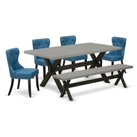 X697Si121-6 East West Furniture X697Si121-6 6-Pc Dinette Room Set- 4 Dining Room Chairs With Blue Linen Fabric Seat And Button Tufted Chair Back - Rectangular Top & Wooden Cross Legs Kitchen Dining Table And Wood Bench - Cement And Black Finish, East West Furniture 6-Pc Kitchen Table Set- 4 Stunning Parson Dining Chairs, 1 Rectangular Table And Dining Benchthis 6-Pc Dining Room Table Set Consists Of 4 Parson Dining Chairs, 1 Dining Table And A Dining Table Bench. These Kitchen Parson Chairs Have A Linen Fabric Seat, Button Tufted Chair Back, And The Kitchen Table Is Consists Of A Rectangular Top And Wooden Cross Legs. The Parson Chairs Seat, The Chair Back Is Produced From Linen Fabric In A Blue Color Padded Parson Chair Hardwood Frame, And The Linen Fabric Seat Is Quite Simple To Clean. You Can Clean Dust Easily And Frequently To Save Time By Using A Damp Cloth. These Kitchen Parson Chairs And The Modern Rectangular Dining Table Is The Ideal Choice For Your Dining Room Or Kitchen. The Quick Frame Of The Padded Parson Chair And The Breakfast Table As Well As Screws Of The Same Size That Allow Fast And Simple Setup.Features:Dining Room Table Set Material: Asian Hardwoodseating Material: Linen Fabricwood Dining Table And Small Bench Top Color: Cementmodern Kitchen Table And Wooden Bench Legs Color: Wire Brushed Blackdining Chair Legs Color: Blackdining Padded Chairs Fabric Color: Bluekitchen Table Dimensions: Length 72; Width 40; Height 30.Upholstered Dining Chairs Dimensions: Length 21.5; Width 19.5; Height 35.5.Small Bench Dimensions: Length 72; Width 15; Height 18.Included In The Package: This Wonderful Modern Dining Room Table, A Mid Century Modern Bench And 4 Fantastic Upholstered Dining Chairs.
