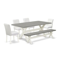 Casafoyer X-Style 6 Piece Modern Dining Set Contains A Rectangle Wooden Table With X-Legs And 4 White Faux Leather Parson Chairs With A Bench, 40X72 Inch, Multi-Color