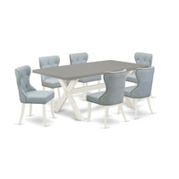 X097Si215-7 East West Furniture X097Si215-7 7-Piece Dining Room Table Set- 6 Upholstered Dining Chairs With Baby Blue Linen Fabric Seat And Button Tufted Chair Back - Rectangular Table Top & Wooden Cross Legs - Cement And Linen White Finish, East West Furniture 7-Pc Modern Dining Table Set- 6 Fantastic Parson Chairs And 1 Dining Tablethe 7-Piece Kitchen Dining Set Consists Of 6 Parson Dining Chairs And 1 Kitchen Table. These Dining Chairs Have A Linen Fabric Seat, Button Tufted Chair Back, And The Dining Room Table Includes A Rectangular Top And Wooden Cross Legs. The Parson Chairs Seat, The Chair Back Is Built From Linen Fabric In A Baby Blue Color Kitchen Parson Chairs Solid Wood Frame, And The Linen Fabric Seat Is Very Easy To Clean. You Can Clean Dirt Easily And Often To Save Time By Using A Damp Cloth. These Dining Room Chairs And The Dining Table Is A Fantastic Choice For Your Dining Room Or Kitchen. The Quick Design Of The Dining Room Chairs And The Wood Dining Table As Well As Screws Of The Same Size That Allow Fast And Simple Put Together.Features:Modern Dining Set Material: Asian Hardwoodseating Material: Linen Fabricdining Room Table Top Color: Cementmodern Dining Room Table Legs Color: Wire Brushed Linen Whiteparson Chairs Legs Color: Linen Whitekitchen Parson Chairs Fabric Color: Baby Bluedining Table Dimensions: Length 72; Width 40; Height 30.Parson Dining Room Chairs Dimensions: Length 21.5; Width 19.5; Height 35.5.Included In The Package: One Excellent Wooden Dining Table And 6 Lovely Parson Chairs.
