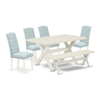 Casafoyer X026Ce215-6 6 Piece Dining Table Set Contains A Rectangle Dining Room Table With X-Legs And 4 Baby Blue Linen Fabric Parson Chairs With A Bench, 36X60 Inch, Multi-Color