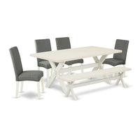 X027Dr207-6 East West Furniture 6-Piece Wooden Dining Table Set-Gray Smoke Linen Fabric Seat And Stylish Chair Back Dining Chairs, A Rectangular Bench And Rectangular Top Dining Table With Hardwood Legs - Linen White And Linen White Finish, East West Furniture 6-Piece Dining Set With 4 Upholstered Dining Chairs - Mid Century Modern Bench And Rectangular Dining Tablethis Dining Room Set Includes 4 Gorgeous Upholstered Dining Chairs, An Amazing Indoor Bench, And A Gorgeous Wood Table. This Kitchen Rectangular Table Is Offered In An Elegant Linen White Finish. In Addition, The Modern Dining Chairs In A Gray Smoke Linen Fabric And Awesome Linen White Indoor Bench Top To Enhance The Elegance Of Any Kitchen Or Dining Room. Our Kitchen Set Delivers Great Durability Because This Wood Table And Kitchen Bench Is Built From High Quality Asian Wood Which Can Bear The Weight Of 300 Lbs. We Have Created These Dining Room Chairs And Wood Dining Table, Small Bench With The Help Of Highly Experienced Carpenters, Who Generate A Smooth And High-End Finish To This Rectangular Dining Room Table Set. We Try To Offer Innovative As Well As Easy To Assemble Products. Our High-Quality Dining Room Table Set Is Perfect For You And Your Beautiful Dining Room As Well As The Kitchen Area. You Can Use It For Casual Home Parties Or For Intimated Gatherings. Keep Enjoying East West Modern Furniture!Features:Color Of Kitchen Chairs: Gray Smokecolor Of Rectangular Table Top: Linen Whitecolor Of Modern Dining Table Base: Linen Whitecolor Of Dining Room Bench Top: Linen Whitecolor Of Mid Century Modern Bench Base: Linen Whitekitchen Rectangular Table Dimensions: Length 60; Width 36; Height 30Modern Dining Chairs Dimensions: Length 19; Width 25; Height 41Dining Bench Dimensions: Length 72; Width 15; Height 18Package Include: 4 Upholstered Dining Chairs And A Rectangular Wood Dining Table And An Attractive Wood Bench