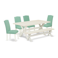 X027En257-6 East West Furniture 6-Piece -Pond Linen Fabric Seat And Button Tufted Chair Back Parson Chairs, A Rectangular Bench And Rectangular Top Wood Dining Table With Wooden Legs - Linen White And Linen White Finish, East West Furniture 6-Pc Dining Room Set With 4 Parson Chairs - Indoor Bench And Rectangular Dining Tablethis Kitchen Set Includes 4 Amazing Kitchen Chairs, An Awesome Wooden Bench, And A Wonderful Dining Table. This Dining Table Is Offered In An Elegant Linen White Finish. In Addition, The Dining Room Chairs In A Pound Linen Fabric And A Wonderful Linen White Small Bench Top To Enhance The Elegance Of Any Kitchen Or Dining Room. Our Dining Room Set Provides Great Durability Because This Modern Dining Table And Dining Room Bench Is Built From High Quality Asian Wood Which Can Bear The Weight Of 300 Lbs. We Have Created These Parson Chairs And Kitchen Rectangular Table, Wood Bench With The Help Of Highly Experienced Carpenters, Who Generate A Smooth And High-End Finish To This Dining Room Table Set. We Try To Offer Innovative As Well As Easy To Assemble Products. Our High-Quality Kitchen Set Is Perfect For You And Your Beautiful Dining Room As Well As The Kitchen Area. You Can Use It For Casual Home Parties Or Intimated Gatherings. Keep Enjoying East West Modern Furniture!Features:Color Of Kitchen Chairs: Poundcolor Of Dining Room Table Top: Linen Whitecolor Of Wood Table Base: Linen Whitecolor Of Mid Century Modern Bench Top: Linen Whitecolor Of Small Bench Base: Linen Whiterectangular Dining Table Dimensions: Length 72; Width 40; Height 30Dining Chairs Dimensions: Length 22; Width 19; Height 41Dining Bench Dimensions: Length 72; Width 15; Height 18Package Include: 4 Kitchen Parson Chairs And A Rectangular Table And A Beautiful Kitchen Bench