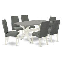 X096Dr207-7 East West Furniture X096Dr207-7 7-Pc Modern Dining Table Set - 6 Dining Room Chairs And 1 Modern Rectangular Cement Dining Room Table Top With High Chair Back - Linen White Finish, East West Furniture - X096Dr207-7 - 7-Pc Kitchen Table Setthis Kitchen Dining Set Includes 6 Mid Century Parson Dining Chairs And 1 Wooden Dining Table. This Dining Table Has A Rectangular Table Top And Beautiful Legs. The Solid Wood Body And Soft Padded Back Ensure That These Dining Chairs Sturdiness And Offers Decent Support To Your Back, In Addition To Their Ideal Size These Urban Style Chairs Are Trouble-Free To Build And Easy To Rearrange. These Simple But Charming Kitchen Chairs Will Add Ambiance And Style To Your Dining Room. Offer Your Home A Pop Of Chic Style With This Must-Have Dining Room Set. A Contemporary Twist On A Classic Design, This Eye-Catching Modern Dining Set Design Will Liven Up Any Timeless Appeal. Just By Switching Out Your Chairs And Rectangular Table, You Can Effortlessly Refresh Your Dining Space. This Dining Room Table Set Is Very Easy To Assemble. You Only Need Around 1 Hour To Build This Modern Dining Table Set. This Dinette Set Comes With All The Necessary Hardware To Construct This Dinette Room Set. These Parson Dining Room Chairs Are Easy To Carry Or Move Around. Enjoy With East West Furniture!Features:Fabric: Linen Fabriccushion Material: Foamfabric Color: Graymodern Rectangular Dining Table Top Color: Cementdining Chairs Dimensions Are: Length 24; Width 19; Height 39.Kitchen Dining Table Dimensions Are: Length 60; Width 36; Height 30.Included In The Package: 1 Wonderful Rectangular Table And 6 Fabulous Padded Parson Chairs.