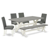 X097Dr207-6 East West Furniture X097Dr207-6 6-Pc Dinette Set - 4 Kitchen Parson Chairs, A Dining Table Bench Cement Top And 1 Modern Cement Dining Table Top With High Chair Back - Linen White Finish, East West Furniture - X097Dr207-6 - 6-Piece Dining Table Setthis Dining Room Table Set Includes 4 Padded Parson Chairs, A Dining Bench, And 1 Modern Dining Room Table. This Modern Dining Table And Small Bench Have A Rectangular Table Top And Beautiful Legs. The Hardwood Frame And Soft Padded Back Ensure That These Kitchen Parson Chairs Sturdiness And Offers Decent Support To Your Back, In Addition To Their Ideal Size These Urban Style Chairs Are Trouble-Free To Construct And Easy To Rearrange. These Simple But Charming Dining Chairs Will Add Ambiance And Style To Your Dining Room. Offer Your Home A Pop Of Chic Style With This Must-Have Dining Table Set. A Contemporary Twist On A Classic Design, This Eye-Catching Kitchen Dining Room Set Design Will Liven Up Any Timeless Appeal. Just By Switching Out Your Chairs And Rectangular Table, You Can Effortlessly Refresh Your Dining Space. This Dining Room Set Is Very Easy To Assemble. You Only Need Around 1 Hour To Build This Dinette Room Set. This Dining Table Set Comes With All The Necessary Hardware To Construct This Dinette Set. These Parson Dining Chairs Are Easy To Carry Or Move Around. Enjoy With East West Furniture!Features:Fabric: Linen Fabriccushion Material: Foamfabric Color: Grayrectangular Dining Table Top Color: Cementmid Century Modern Bench Top Color: Cementparson Dining Room Chairs Dimensions Are: Length 24; Width 19; Height 39.Modern Dining Room Table Dimensions Are: Length 72; Width 40; Height 30.Mid Century Modern Bench Dimensions Are: Length 72; Width 15; Height 18.Included In The Package: 1 Fabulous Modern Rectangular Dining Table, 4 Gorgeous Parson Chairs, And A Wooden Bench.