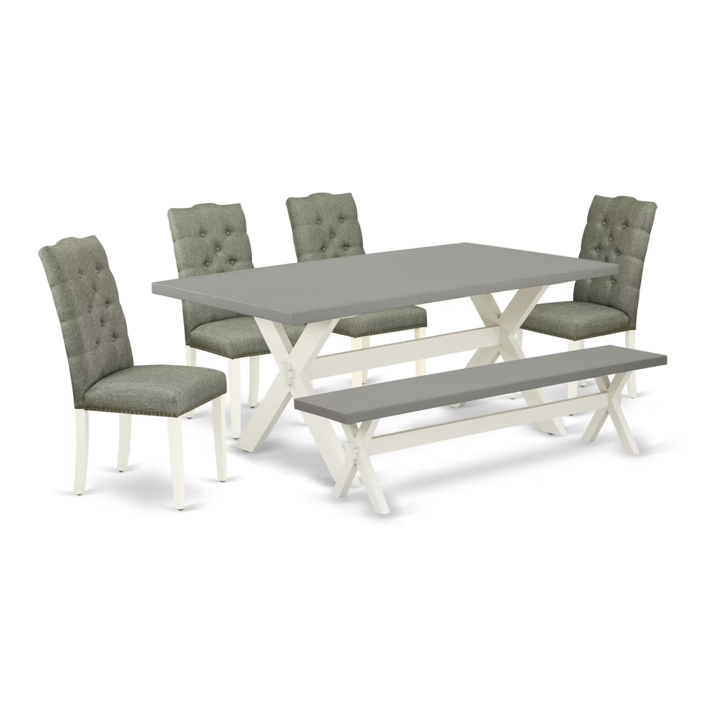 X097El207-6 East West Furniture 6-Pc Dinette Room Set- 4 Parson Chairs With Smoke Linen Fabric Seat And Button Tufted Chair Back - Rectangular Top & Wooden Cross Legs Dining Room Table And Small Bench - Cement And Linen White Finish, East West Furniture 6-Piece Modern Dining Set- 4 Stunning Upholstered Dining Chairs, 1 Dining Table And Wooden Benchour 6-Pc Kitchen Dining Room Set Consist Of 4 Mid Century Dining Chairs, 1 Kitchen Dining Table And Mid Century Modern Bench. These Parson Chairs Have A Linen Fabric Seat, Button Tufted Chair Back, And The Modern Kitchen Table Includes A Rectangular Top And Wooden Cross Legs. The Dining Chairs Seat, The Chair Back Is Made Of Linen Fabric In A Smoke Color Kitchen Parson Chairs Solid Wood Structure, And The Linen Fabric Seat Is Very Easy To Clean. You Can Clean Dust Easily And Frequently To Save Time By Using A Damp Cloth. These Parson Chairs And The Breakfast Table Is A Fantastic Choice For Your Dining Room Or Kitchen. The Easy Structure Of The Kitchen Parson Chairs And The Rectangular Dining Table As Well As Screws Of The Same Size That Allow Quick And Easy Build.Features:Dining Room Set Material: Asian Hardwoodseating Material: Linen Fabricdining Table And Kitchen Table Bench Top Color: Cementdining Room Table And Kitchen Table Bench Legs Color: Wire Brushed Linen Whitemid Century Dining Chairs Legs Color: Linen Whiteparson Chairs Fabric Color: Smokedining Room Table Dimensions: Length 72; Width 40; Height 30.Kitchen Parson Chairs Dimensions: Length 19; Width 25; Height 41.Kitchen Table Bench Dimensions: Length 72; Width 15; Height 18.Included In The Package: This Excellent Rectangular Dining Table, A Kitchen Table Bench And 4 Beautiful Upholstered Dining Chairs.