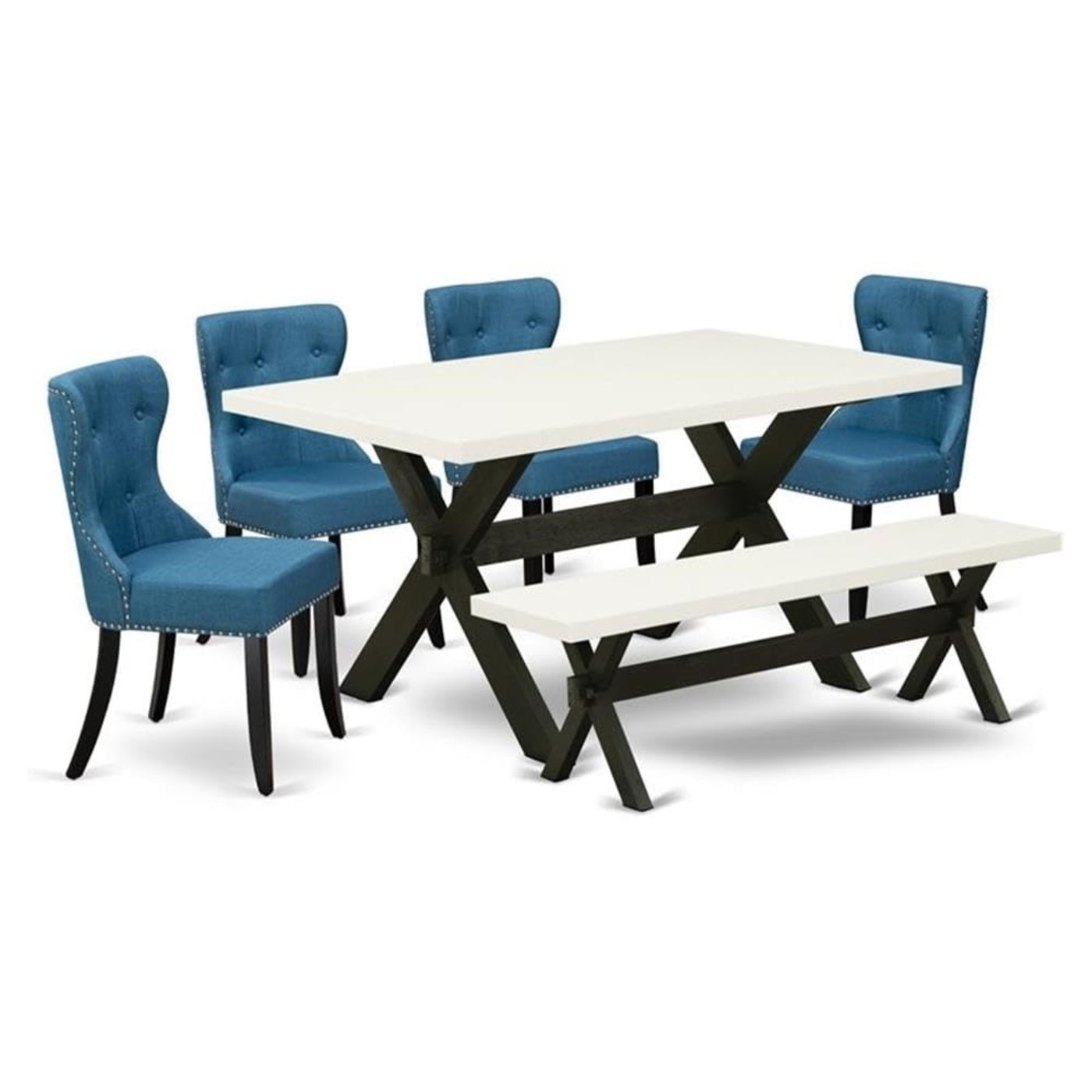 X626Si121-6 East West Furniture X626Si121-6 6-Piece Dining Table Set- 4 Upholstered Dining Chairs With Blue Linen Fabric Seat And Button Tufted Chair Back - Rectangular Top & Wooden Cross Legs Dining Table And Dining Bench - Linen White And Black Finish, East West Furniture 6-Piece Dining Room Table Set- 4 Fantastic Mid Century Dining Chairs, 1 Rectangular Table And Kitchen Table Benchour 6-Piece Kitchen Dining Room Set Consist Of 4 Parson Dining Room Chairs, 1 Rectangular Dining Table And Kitchen Table Bench. These Upholstered Dining Chairs Have A Linen Fabric Seat, Button Tufted Chair Back, And The Dining Table Is Consists Of A Rectangular Top And Wooden Cross Legs. The Parson Dining Chairs Seat And The Chair Back Is Constructed From Linen Fabric In A Blue Color Kitchen Chairs Hardwood Frame And The Linen Fabric Seat Is Very Easy To Clean. You Can Clean Dust Easily And Frequently To Save Time By Using A Damp Cloth. These Dining Room Chairs And The Modern Kitchen Table Is The Ideal Choice For Your Dining Room Or Kitchen. The Quick Construction Of The Dining Chair And The Modern Kitchen Table As Well As Screws Of The Same Size That Allow Quick And Easy Build.Features:Kitchen Table Set Material: Asian Hardwoodseating Material: Linen Fabricbreakfast Table And Kitchen Table Bench Top Color: Linen Whitedining Table And Dining Table Bench Legs Color: Wire Brushed Blackparson Dining Room Chairs Legs Color: Blackdining Chair Fabric Color: Bluemodern Dining Room Table Dimensions: Length 60; Width 36; Height 30.Parson Dining Chairs Dimensions: Length 21.5; Width 19.5; Height 35.5.Small Bench Dimensions: Length 60; Width 15; Height 18.Included In The Package: One Excellent Dining Table, A Dining Bench And 4 Fantastic Kitchen Chairs.