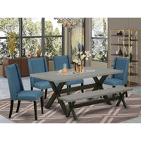 Casafoyer X697Fl121-6 6 Piece Dining Room Set Contains A Rectangle Dining Table With X-Legs And 4 Blue Linen Fabric Upholstered Chairs With A Bench, 40X72 Inch, Multi-Color