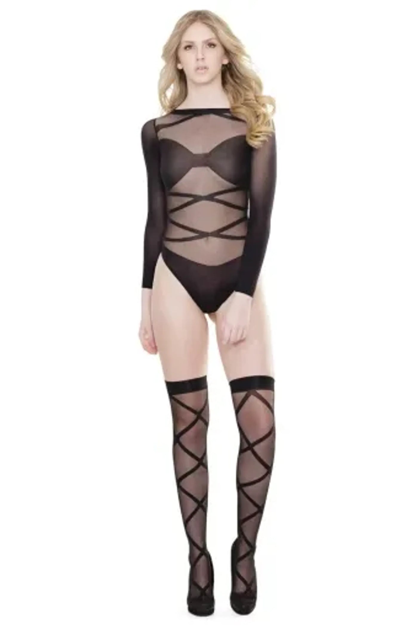Opaque And Sheer Print Long Sleeve Teddy Includes Stockings