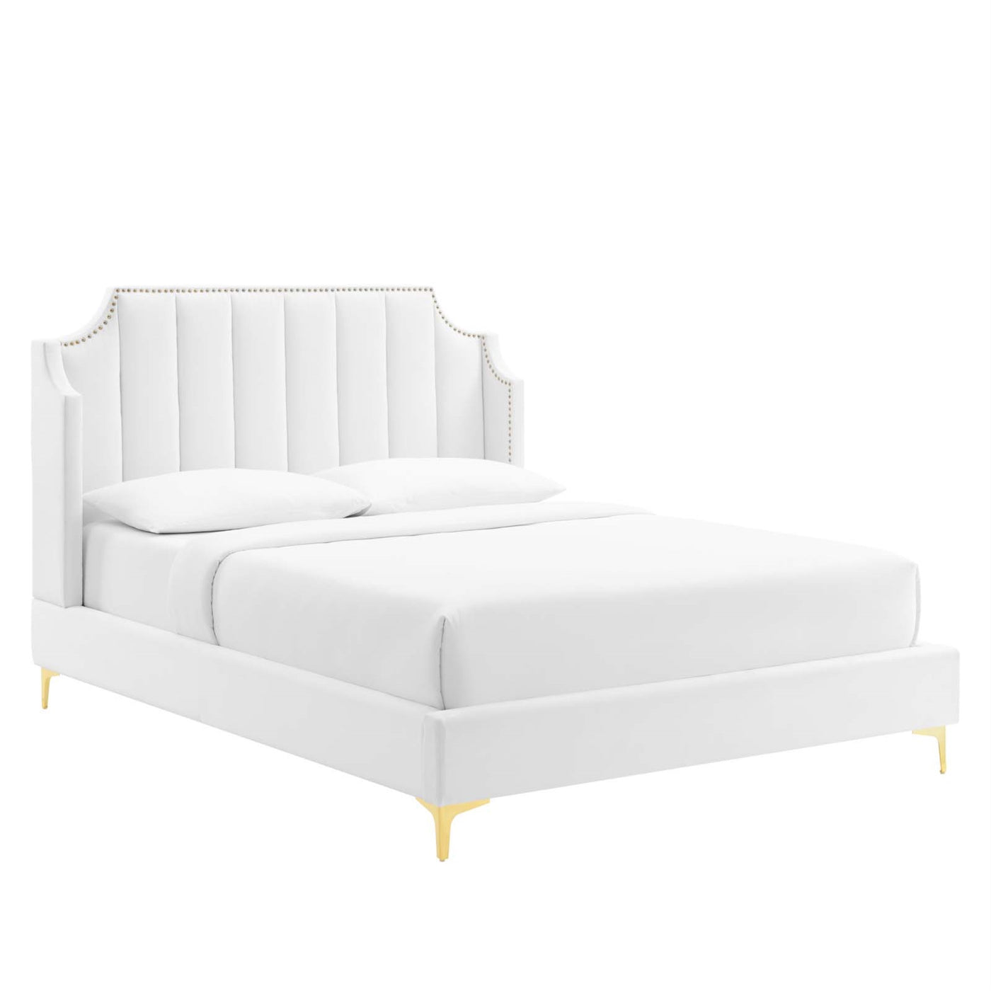 Inspire Tasteful Elegance And Vintage Modernity In A Master Bedroom Or Guest Bedroom With The Daniella Performance Velvet Queen Platform Bed. This Tufted Bed Brings A Glam Deco Presence To Your Bedroom With Its Channel Tufting, Nailhead Trim, And Unique Wingback Design. The Padded Queen Headboard And Side Rails Come Covered In Soft, Stain-Resistant Performance Velvet Upholstery That Grants Rich Texture To The Luxurious Design And A Supportive Place To Rest While Sitting Up And Relaxing In Bed. Resting Atop Gold Metal Legs, This Platform Bed Frame, Crafted With Mdf, Plywood, And Lvl, Is A Sturdy Mattress Foundation For Memory Foam, Innerspring, Latex, And Hybrid Mattresses. With Supporting Legs And A Reinforced Center Beam, This Upholstered Bed Is Complete With A Poplar Wood Slat Support System That Offers Lasting Stability And Healthy Air Circulation. Assembly Required. Queen Bed Weight Capacity: 800 Lbs. Set Includes: One - Daniella Queen Platform Bed