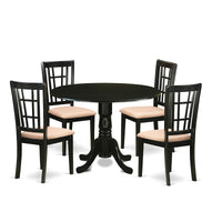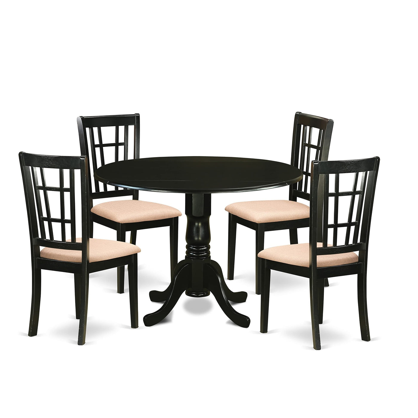 Dlni5-Blk-C Dining Room Set, 5-Piece Modern Round Table With Dropleaf, 4 Linen Fabric Chairs, Asian Rubber Wood, Sleek Black, 42X42 Inch