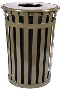 The M3601-Ft-Bn-Vv Ergode Trash Receptacle Is An Outdoor Waste Receptacle Constructed From Durable Flat Bar Steel, Designed To Resist Graffiti. It Features A Metal Band At The Top For Added Strength. The Receptacle Is Coated With Tgic Powder To Ensure Its Resilience In Outdoor Conditions. It Comes With A Flat Top Lid, Black Plastic Liner, Stainless Steel Leveling Feet, Lid Attachment Kit, And Anchor Kit At No Additional Cost. The Material Used For Construction Is Steel.