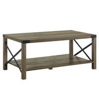 Eli 47 Inch Wood Coffee Table, Metal Brackets, Cross Bars, Rustic Oak Brown