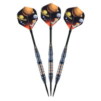 Boldly Take Your Game Where No One Has Gone Before When You Bring The Elkadart Orbital Steel Tip Darts, Designed For Use With Sisal Dart Boards. These Darts Are Packed With Features Starting With The Barrel, Fashioned From Chromed Bronze Alloy. Constructing The Darts In This Fashion Allows Us To Bring You Tough, Weighted Barrels Without Breaking The Bank. Used In Construction For Its High End Appearance And Durability At A Lower Cost, We Use This Alloy To Provide The Highest Quality Barrels At The Best Cost To You. Each Barrel Possesses Recessed Rings Allowing Your Grip To Remain Precise Throw After Throw. The Orbital Darts Feature Tough, Lightweight Aluminum Shafts. These Shafts Feature Locking Holes That Allow A More Secure Fit To Your Barrel; You Wont Find Yourself Retightening These Shafts After A Shot Or Two. Finally, Each Dart Is Finished Off With Stellar Solar System Designs Adorning Each Flight, For An Lightspeed Look On Each Dart. Each Set Includes Three Flights, Three Shafts, And A Slim Dart Case.