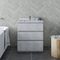 The Fresca Formosa Floor Standing Modern Bathroom Cabinet Is Superbly Crafted Of Solid Acacia Wood, Known For Its Magnificent Beauty And Durability. It Has A Warm Grey Finish With A Hint Of Brown Throughout, And A Natural Grain That Will Inject Luxurious Warmth Into Any Space. A Masterpiece Of Elegance And Style, This Free-Standing Cabinet Measures 29 In Width. Three Solid Wood, Soft-Closing Dovetail Drawers Are Perfect For Organizing All Of Your Daily Essentials. While The First Two Drawers Provide Plenty Of Space, The Third Drawer Is Deeper With Full Storage Capacity. The Solid Pine Drawers Are Clear Coated And Feature A Mitered, Wrap-Around Design That Adds To The Superior Detailing. Cove Routed Pulls Are Carved Directly Into The Drawers Keeping The Design Sharp And Sophisticated.