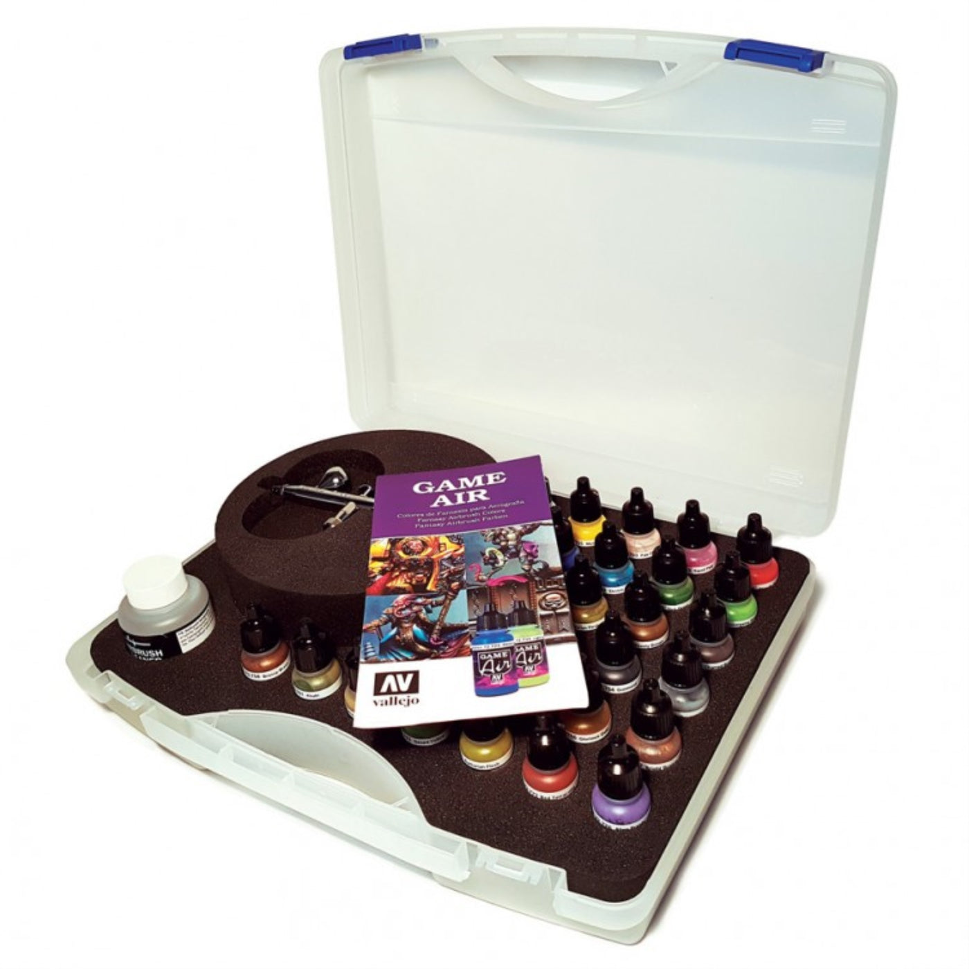 Plastic Carrying Case With 28 Game Air Colors, 1 Airbrush Thinner And 1 Airbrush Cleaner, An Ultra Harder & Steenbeck Airbrush, Hose 2,5 M., 1 Quick Coupling Connection And Color Chart.
