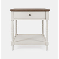 This Grafton Farms End Table Has Generous Lower-Level Shelf Space Supported By Four Beautiful Hand-Turned Legs That Add A Sophisticated Touch. Measuring 24'' X 24'', It Has A Full Sized Drawer On Top With A Traditional Wooden Glide And Brushed Metal Pull That Will Add Depth To Any Room. With The Perfect Blend Of Relaxed Farmhouse Charm And Hand Brushed Antique White Finish, The Grafton Farms Collection Will Look Great Anywhere In Your Home.