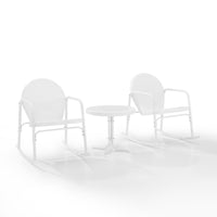Relax And Rock Away With The Retro-Inspired Griffith 3Pc Rocking Chair Set. Made From Sturdy Powder-Coated Steel, The Side Table And Outdoor Rocking Chairs Are Constructed With Durability And Style In Mind. The Low Slanted Seat Of The Patio Chair Allows You To Recline On Smooth Metal Rockers While The Curved Armrests Maximize Comfort. The Round Outdoor Side Table Complements The Rocking Chair With The Perfect Spot To Place Your Drink. Available In A Variety Of Vibrant Colors, This Patio Set Will Create A Lively Spot For Outdoor Relaxation.
